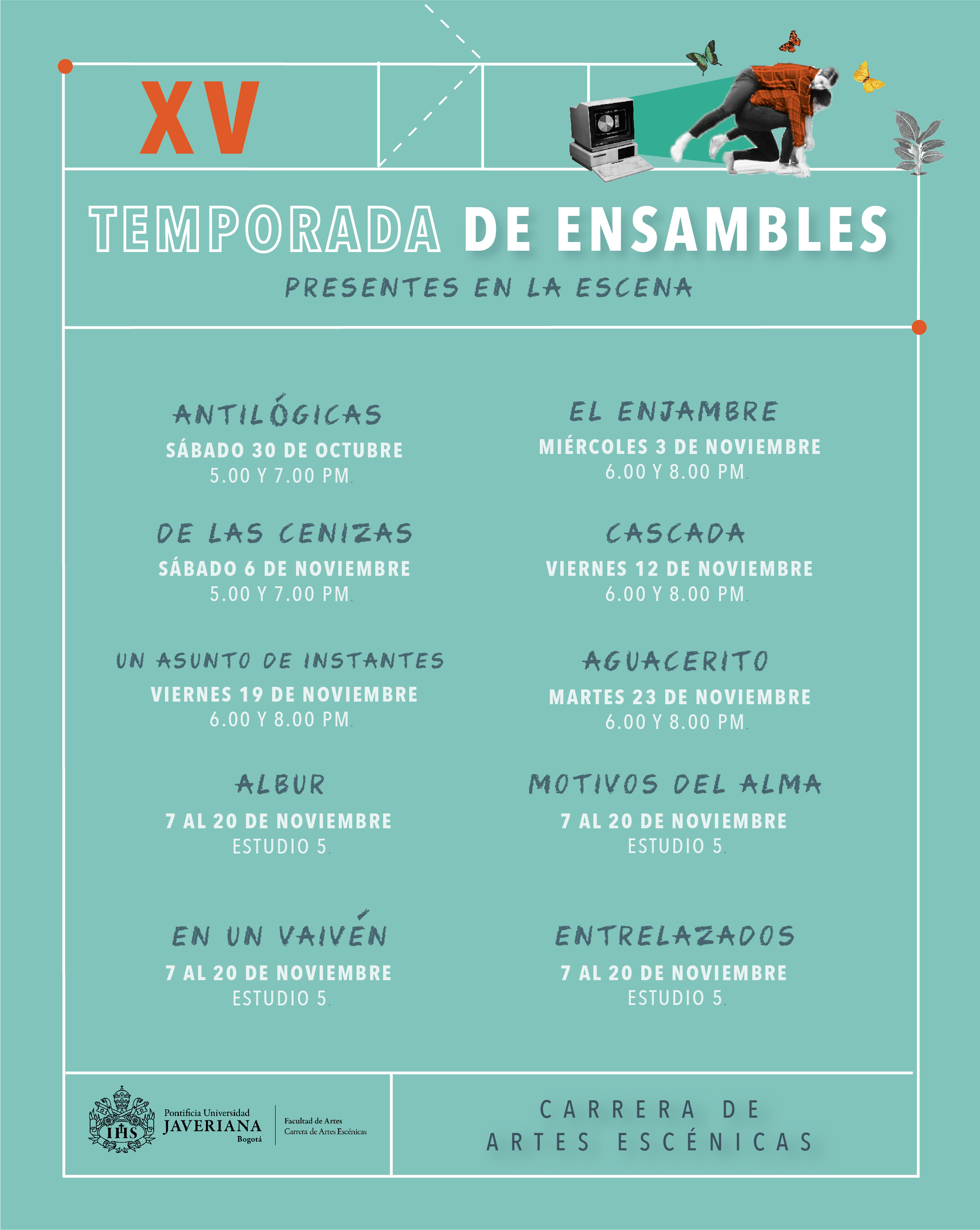 Este sábado 30 de octubre inicia nuevamente la XV Temporada de Ensambles de Artes Escénicas. Luego de dos temporadas completamente virtuales, este segundo semestre de 2021 la Carrera de Artes Escénicas se la juega para volver a la presencialidad con las muestras de ensambles.